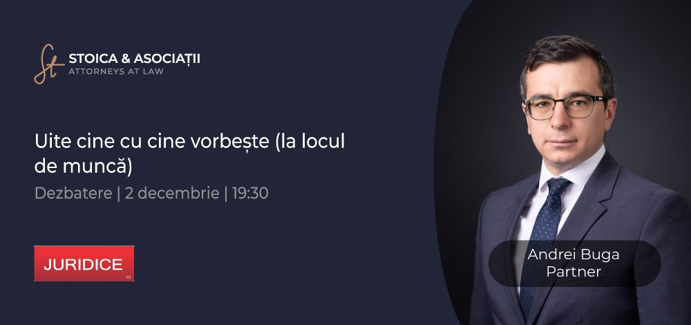 Andrei Buga – Partner - va participa astăzi, de la ora 19.30, la dezbaterea online Uite cine cu cine vorbește (la locul de muncă) organizată de JURIDICE.ro. Invitații vor analiza situațiile în care înregistrarea unei convorbiri telefonice între salariați solicitată într-un litigiu împotriva angajatorului este admisibilă, în lumina prevederilor recente ale hotărârii date de Înalta Curte de Casaţie şi Justiţie – Completul pentru dezlegarea unor chestiuni de drept.