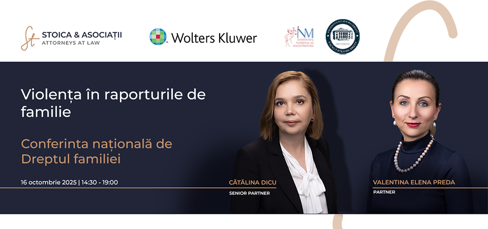 STOICA & ASOCIAȚII este alături de Facultatea de Drept a Universității din București, Institutul Național al Magistraturii, în parteneriat cu Wolters Kluwer România la Conferința națională de Dreptul familiei. Violența în raporturile de familie (ediția a II-a), care va avea loc pe 16 octombrie,începând cu ora 14:30, „Constantin Stoicescu” a Facultății de Drept.