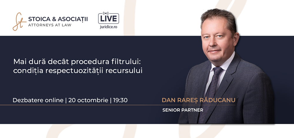 Dan-Rareș Răducanu – Senior Partner - va fi moderatorul dezbaterii online Mai dură decât procedura filtrului: condiția respectuozității recursului, organizată pe 20 octombrie, de la ora 19.30, de JURIDICE.ro.