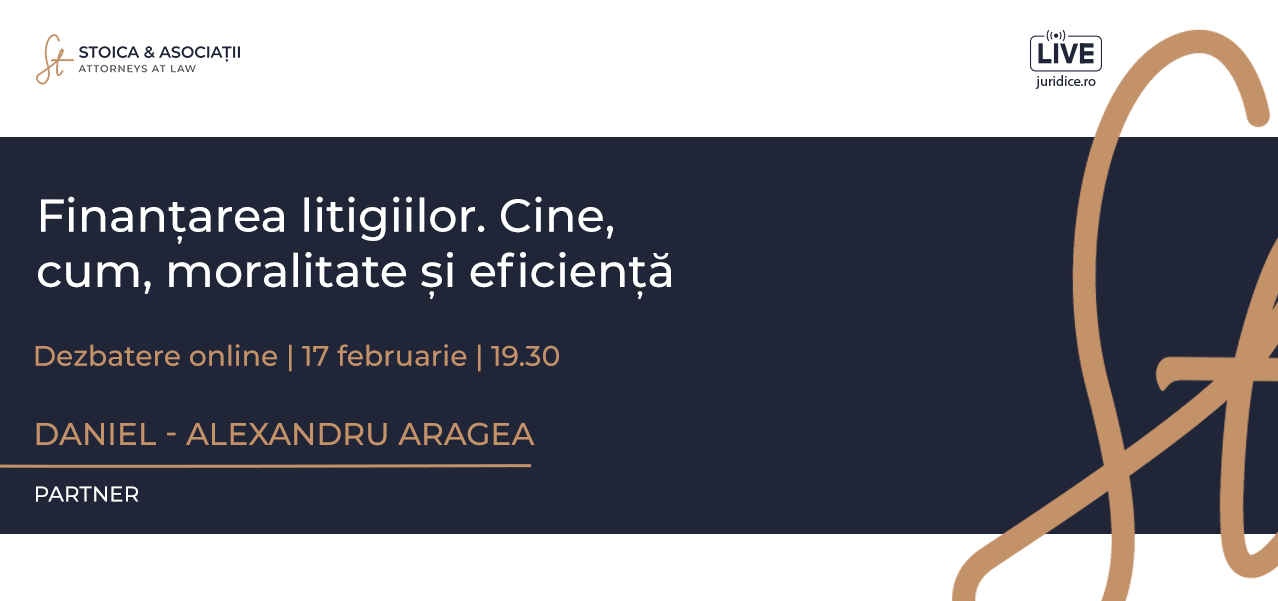 Daniel - Alexandru Aragea – Partner - va participa astăzi, de la ora 19.30, la dezbaterea online Finanțarea litigiilor. Cine, cum, moralitate și eficiență, organizată de JURIDICE.ro.