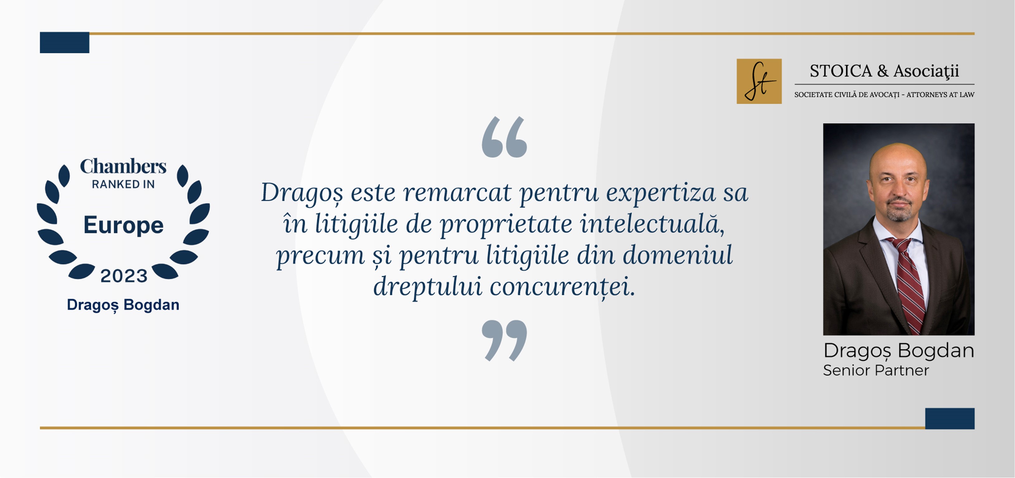 Along with other members of the STOICA & ASOCIAȚII team, the 2023 edition of the prestigious Chambers and Partners lawyer guide recommends Dragoș Bogdan (Senior Partner) for the first time in the Dispute Resolution practice for his "expertise in intellectual property disputes, as well as his regular handling of litigious competition matters".