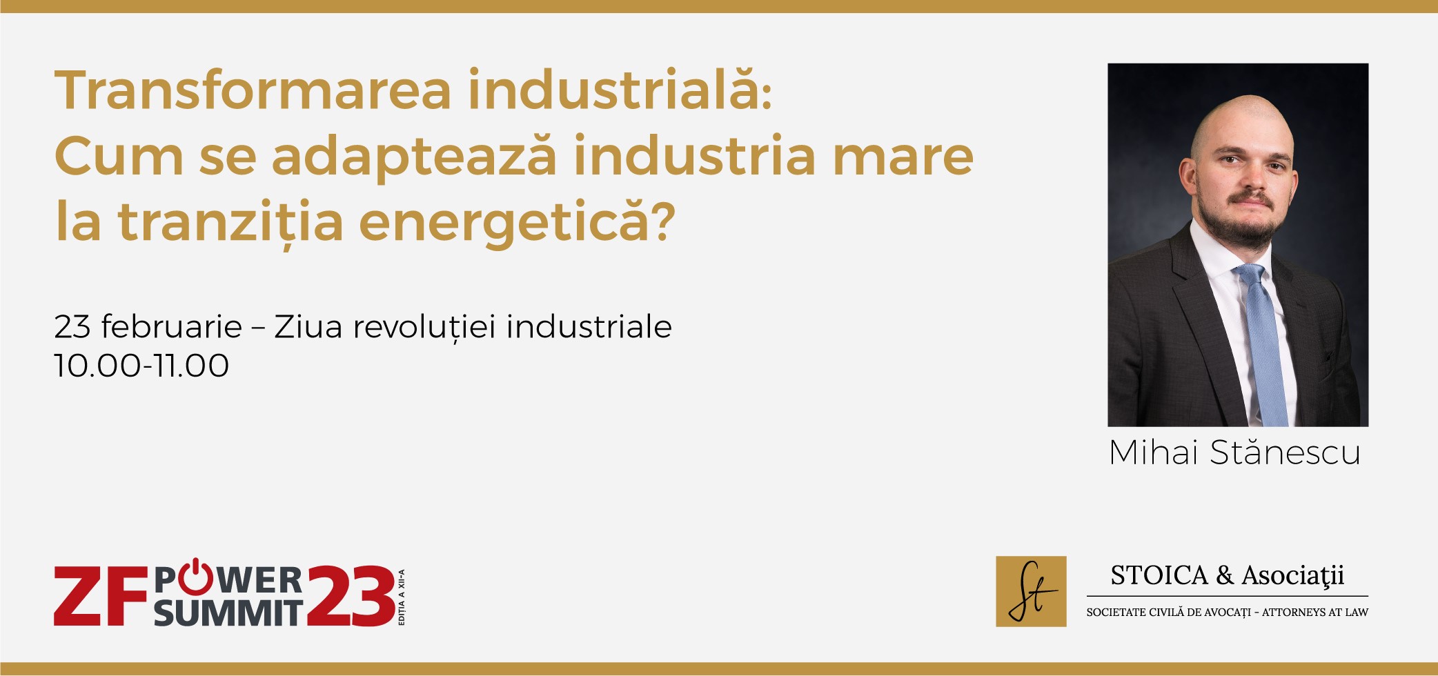 Our colleague, Mihai Stănescu– Managing Associate, STOICA & ASOCIAȚII – will be a speaker tomorrow, February 23, at the ZF Power Summit 2023 conference, in the panel "Industrial transformation: How is the large industry adapting to the energy transition?", with the speech entitled "Until adapting to the energy transition, the large industry must survive".