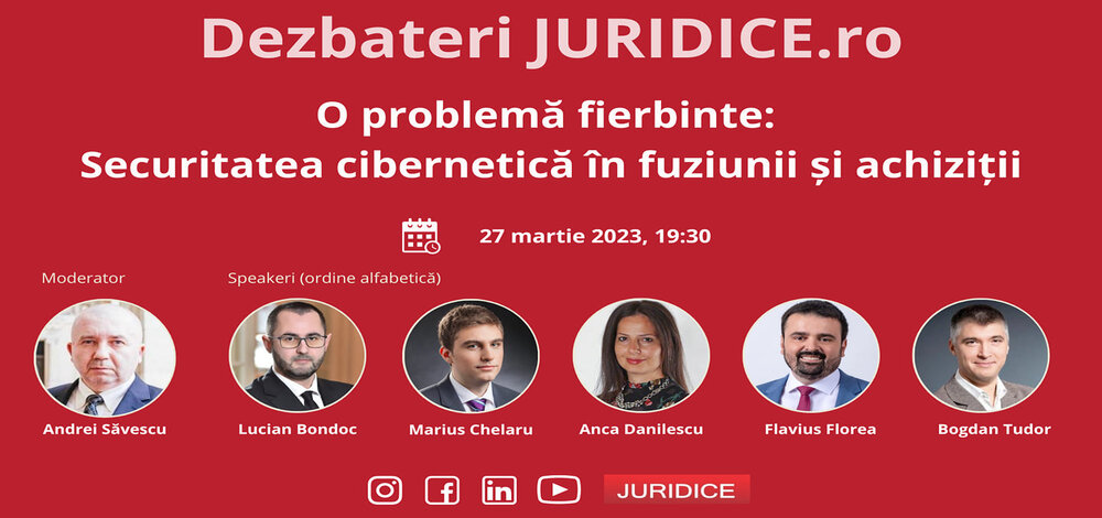 Marius Chelaru – Managing Associate - will participate today, from 19.30, in the online debate A Hot Issue: Cybersecurity in Mergers and Acquisitions (M&A), organized by JURIDICE.ro and moderated by de Andrei Săvescu.
