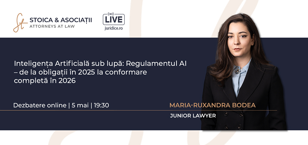 Suntem bucuroși să anunțăm participarea colegei noastre, Maria-Ruxandra Bodea – Junior Lawyer – la dezbaterea online organizată astăzi, de la ora 19.30, de JURIDICE.ro: Inteligența Artificială sub lupă: Regulamentul AI – de la obligații în 2025 la conformare completă în 2026.
