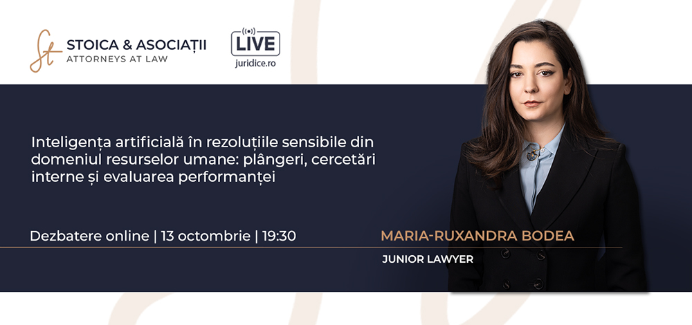 Maria-Ruxandra Bodea – Junior Lawyer – va participa la dezbaterea online organizată astăzi, de la ora 19.30, de JURIDICE.ro: Inteligența artificială în rezoluțiile sensibile din domeniul resurselor umane: plângeri, cercetări interne și evaluarea performanței.