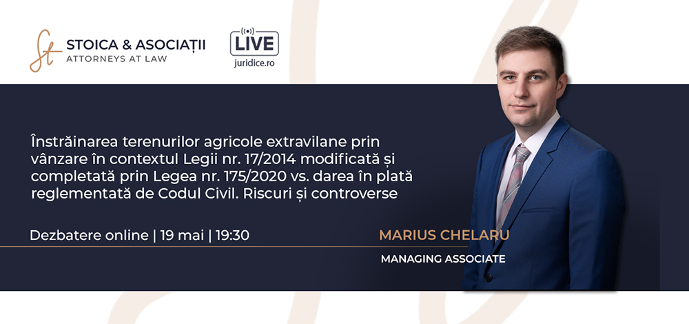 Astăzi, de la ora 19:30, colegul nostru, Marius Chelaru – Managing Associate -, va participa la dezbaterea online organizată de JURIDICE.ro, cu tema: Înstrăinarea terenurilor agricole extravilane prin vânzare în contextul Legii nr. 17/2014 modificată și completată prin Legea nr. 175/2020 vs. darea în plată reglementată de Codul Civil. Riscuri și controverse.