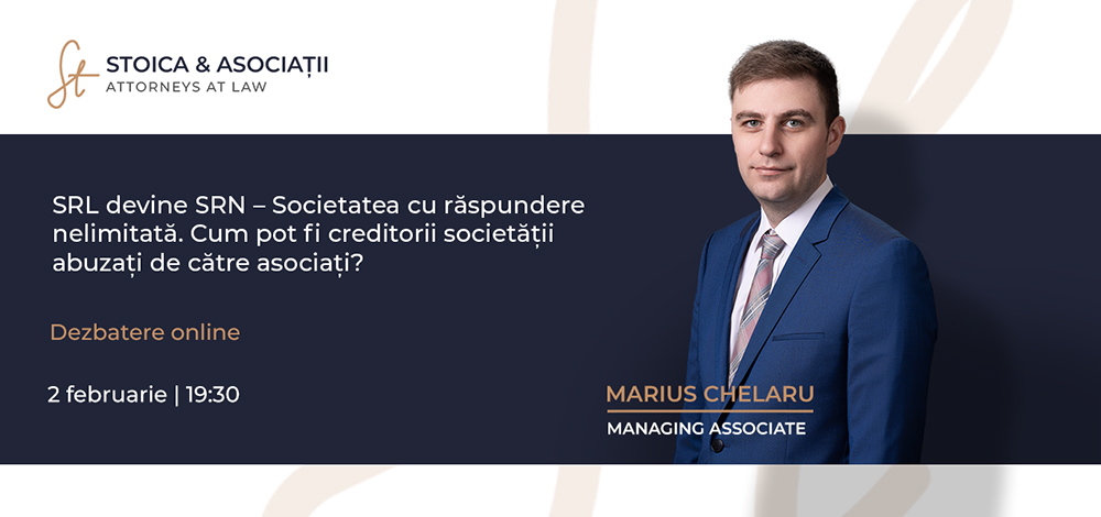 Marius Chelaru– Managing Associate – will participate today, at 7:30 p.m., in the online debate SRL becomes SRN – Unlimited Liability Company. How can the company's creditors be abused by the shareholders? organized by JURIDICE.ro. The debate will cover, among other things, issues related to banking practices whereby shareholders guarantee the company's bank loans and aspects related to the conditioning of tax debt rescheduling on the personal guarantee of shareholders.