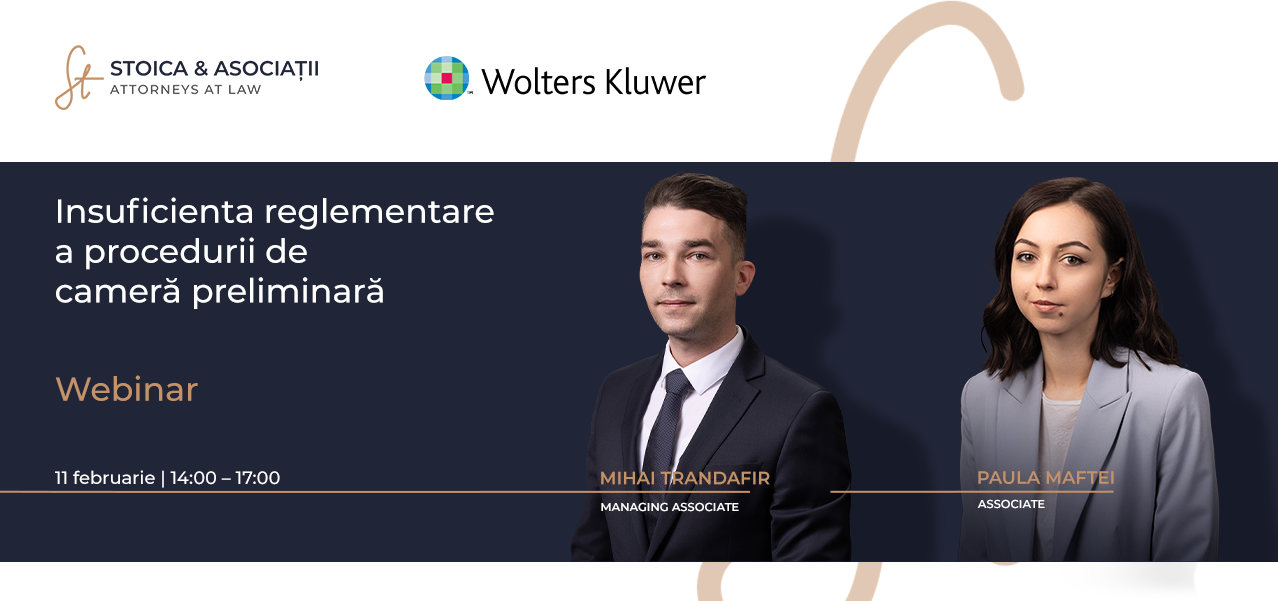 În cadrul webinar-uluiInsuficienta reglementare a procedurii de cameră preliminară, care va avea loc mâine, de la 14:00 – 17:00, colegii noștri, Mihai Trandafir – Managing Associate – și Paula Maftei– Associate -, vor prezenta situațiile concrete întâlnite în practica judiciară, pe care legiuitorul nu le-a reglementat în mod expres și a căror abordare face în continuare obiectul unor soluții și opinii divergente, exprimate în practica judiciară, precum și în doctrina de specialitate.