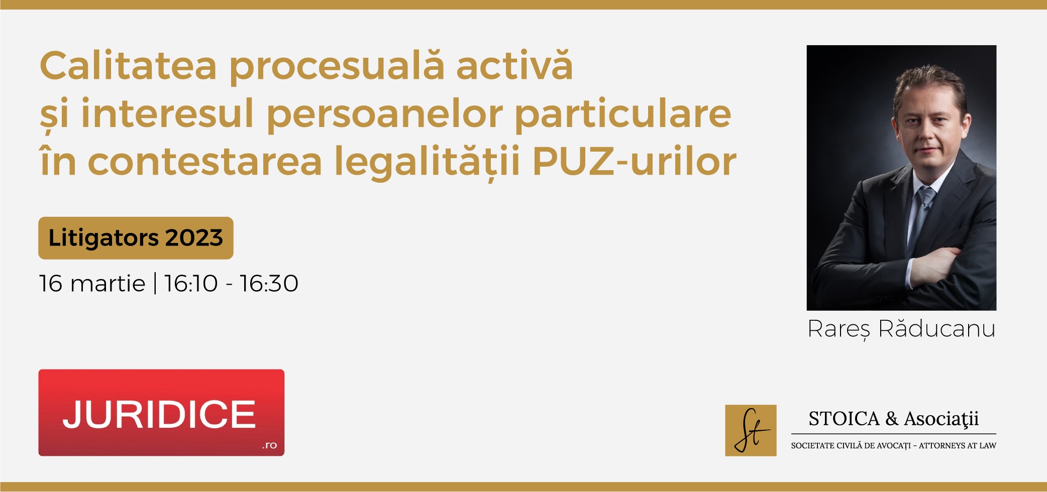 Our colleague, Rareș Răducanu – Senior Partner –, will speak today, from 16:10 to 16:30, about the active procedural quality and the interest of private individuals in contesting the legality of Urban Zoning Plans (Ro. "PUZ”), within the Litigators 2023 conference, an event organized by the Society of Legal Sciences, with the support of JURIDICE.ro partners.