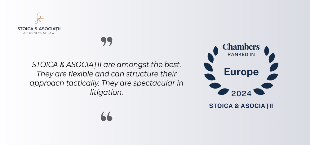 STOICA & ASOCIATII is recommended in the 2024 edition of Chambers Europe, in Dispute Resolution practice – Band 2. We are also happy that many of our colleagues have again been recommended by the prestigious international guide: