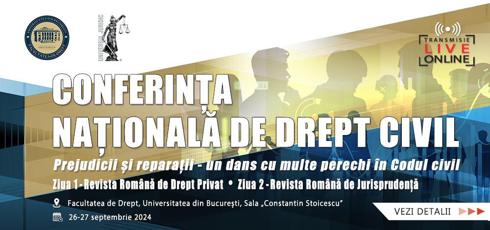 The Law Faculty of the Bucharest University, Universul Juridic Publishing House and STOICA & ASOCIAȚII invite you to participate in the National Civil Law Conference, with the theme " Damages and reparations – a dance with many pairs in the Civil Code ", which will take place September 26-27, at the Faculty of Law of the University of Bucharest, in the "Constantin Stoicescu" hall.