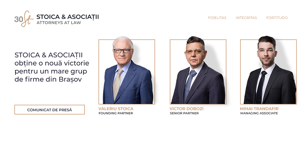 Echipa de avocaţi din cadrul STOICA & ASOCIAȚII, formată din Valeriu Stoica (Founding Partner), Victor Dobozi (Senior Partner) și Mihai Trandafir (Managing Associate), a obținut recent o victorie importantă pentru clientul său, asociat al unui grup de firme din Brașov, în cadrul unui proces penal în care au fost implicați peste 80 de inculpați.